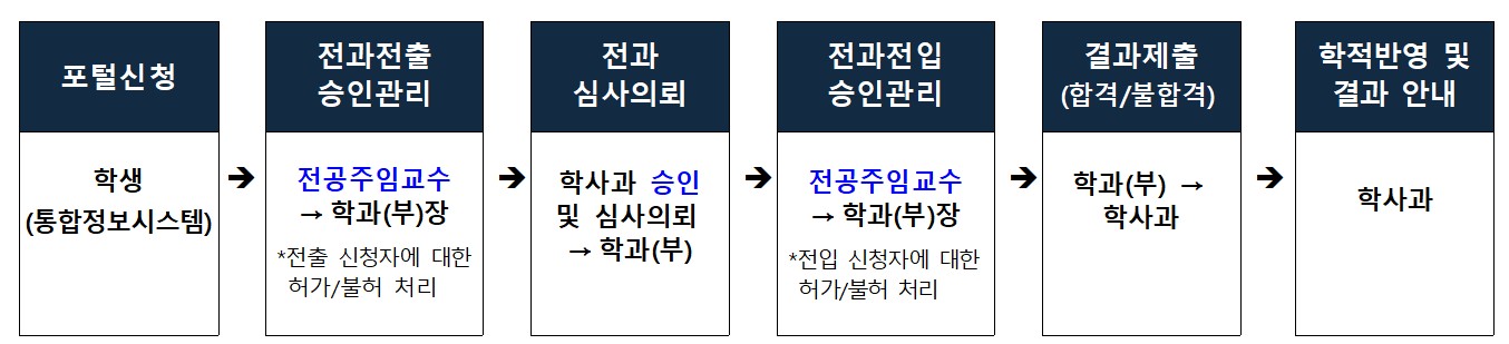 ※ 전공주임교수와 학과(부)장이 상이한 학과는 전과 전입·전출 승인 시 전공주임교수 결재 후 학과(부)장 결재