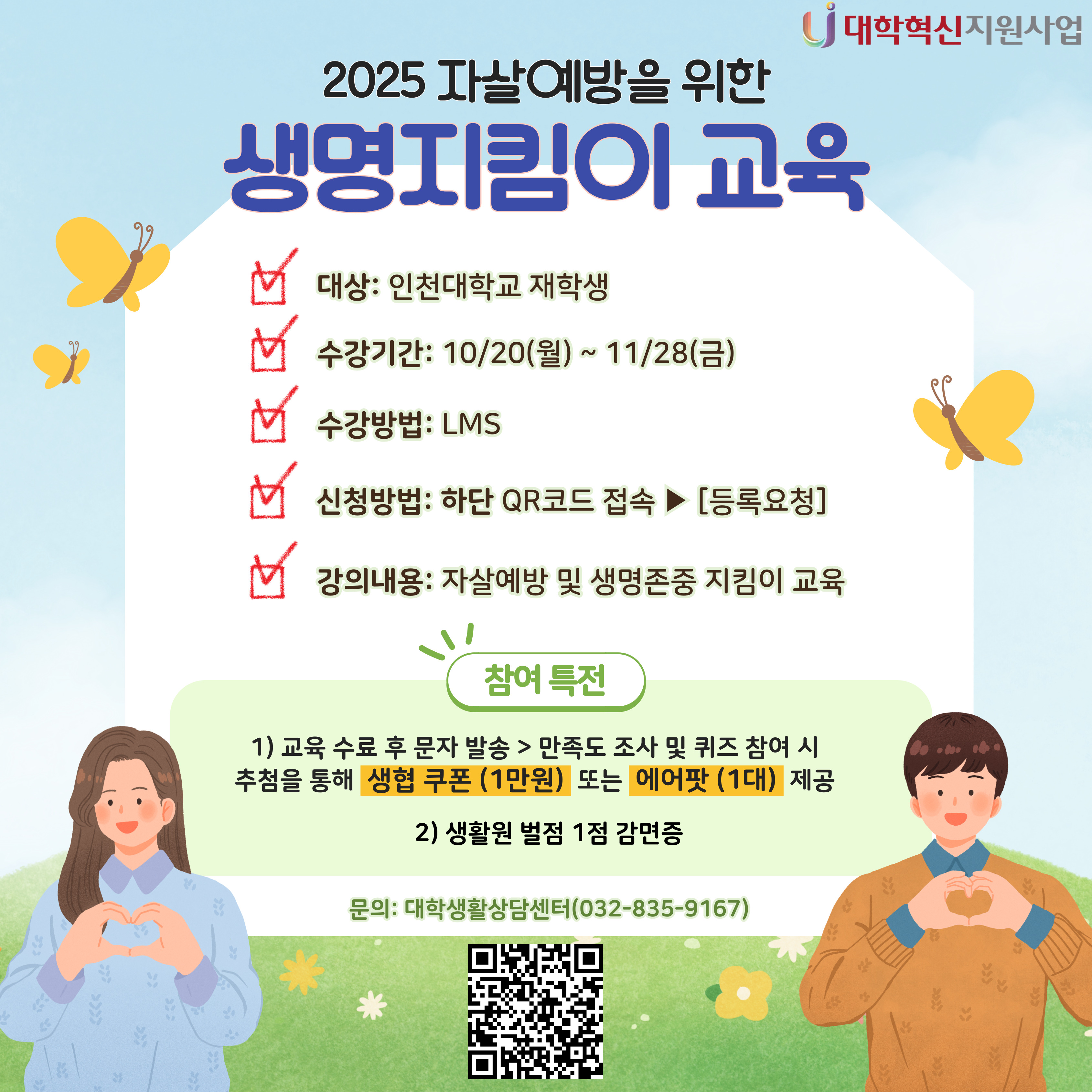 [대학생활상담센터] 2025 생명지킴이 양성교육 (자살예방교육] 수강 안내(10/20~11/28, 생협쿠폰, 에어팟 추첨)