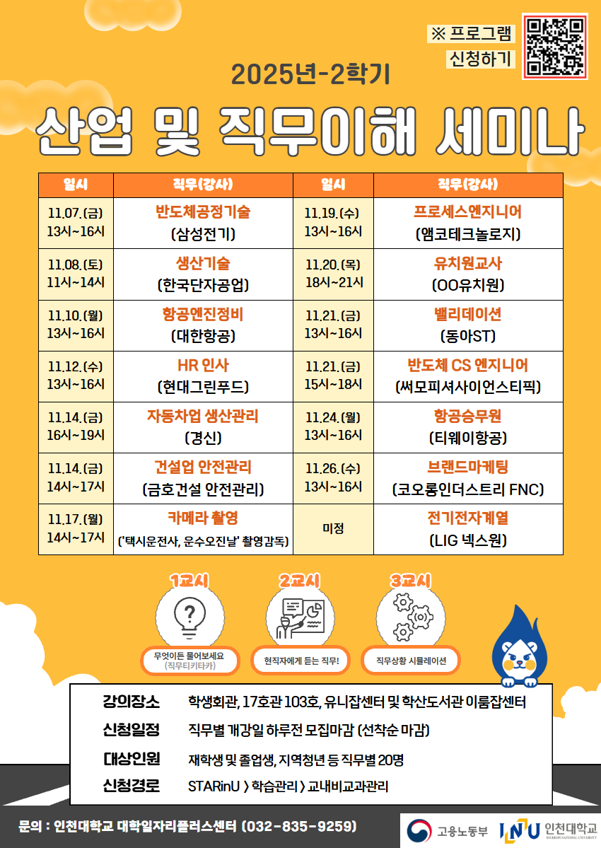 대학일자리플러스센터에서는 재학생 및 졸업생 대상 직무탐색의 기회 제공을 위해 현직자를 섭외하여 『산업 및 직무이해 세미나』를 아래와 같이 실시합니다