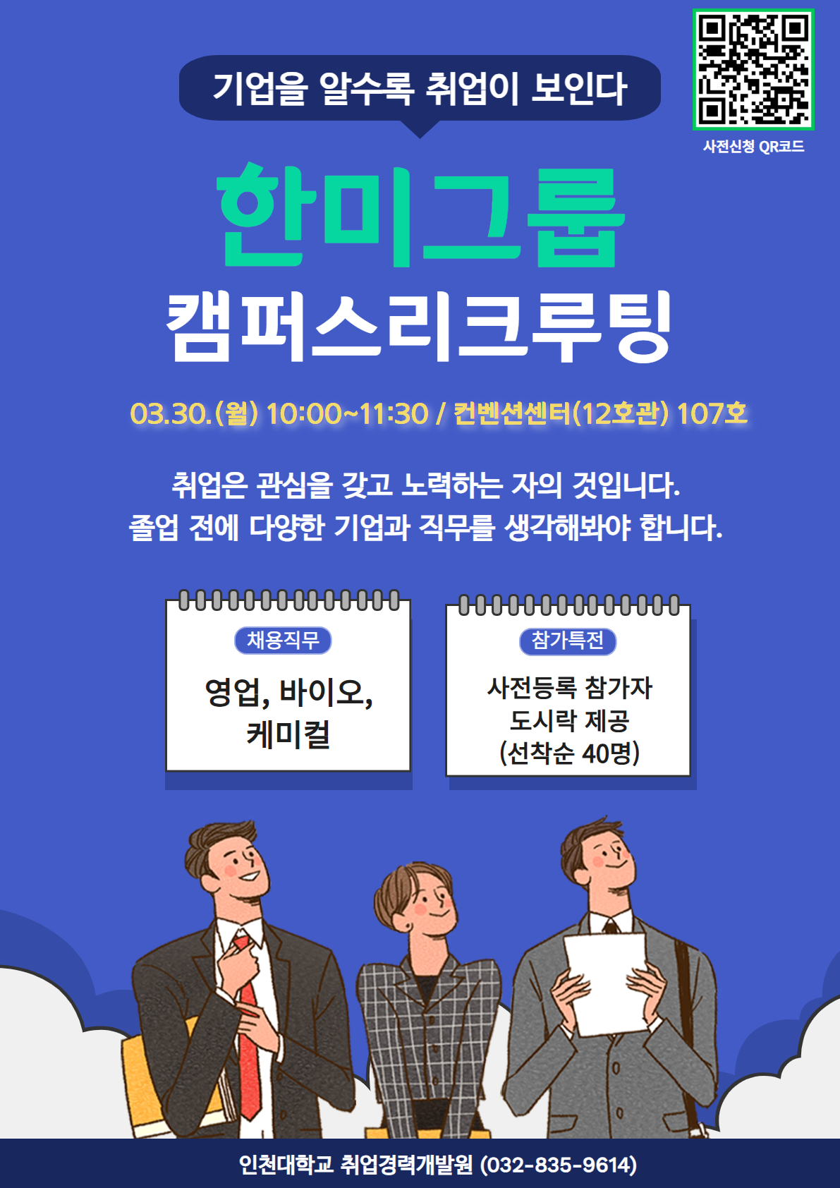 ○ 한미그룹 : 3/30 (월) 10시 - 12호관 107호 : 영업, 바이오, 케미컬 직무로 채용설명회 진행