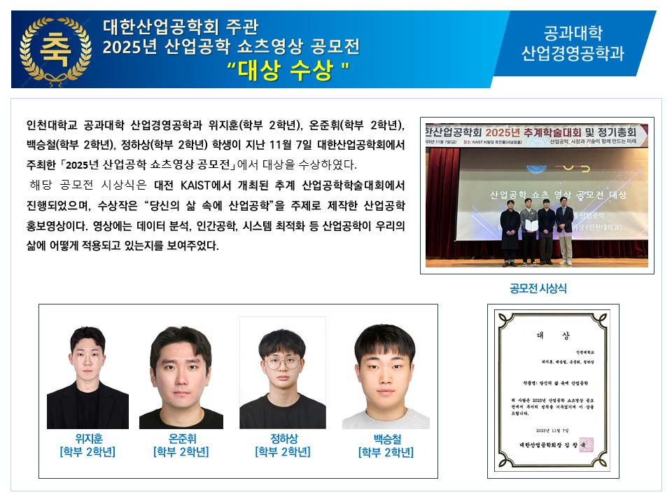 fnctId=bbs,fnctNo=1807 산업경영공학과 / 2025 산업공학 쇼츠영상 공모전 대상 수상 글번호 420026 작성일 2026-02-26 수정일 2026-02-26 작성자 공과대학 (032-835-8401~03) 조회수 31 산업경영공학과 / 2025 산업공학 쇼츠영상 공모전 대상 수상 첨부파일 첨부파일이(가) 없습니다. 목록