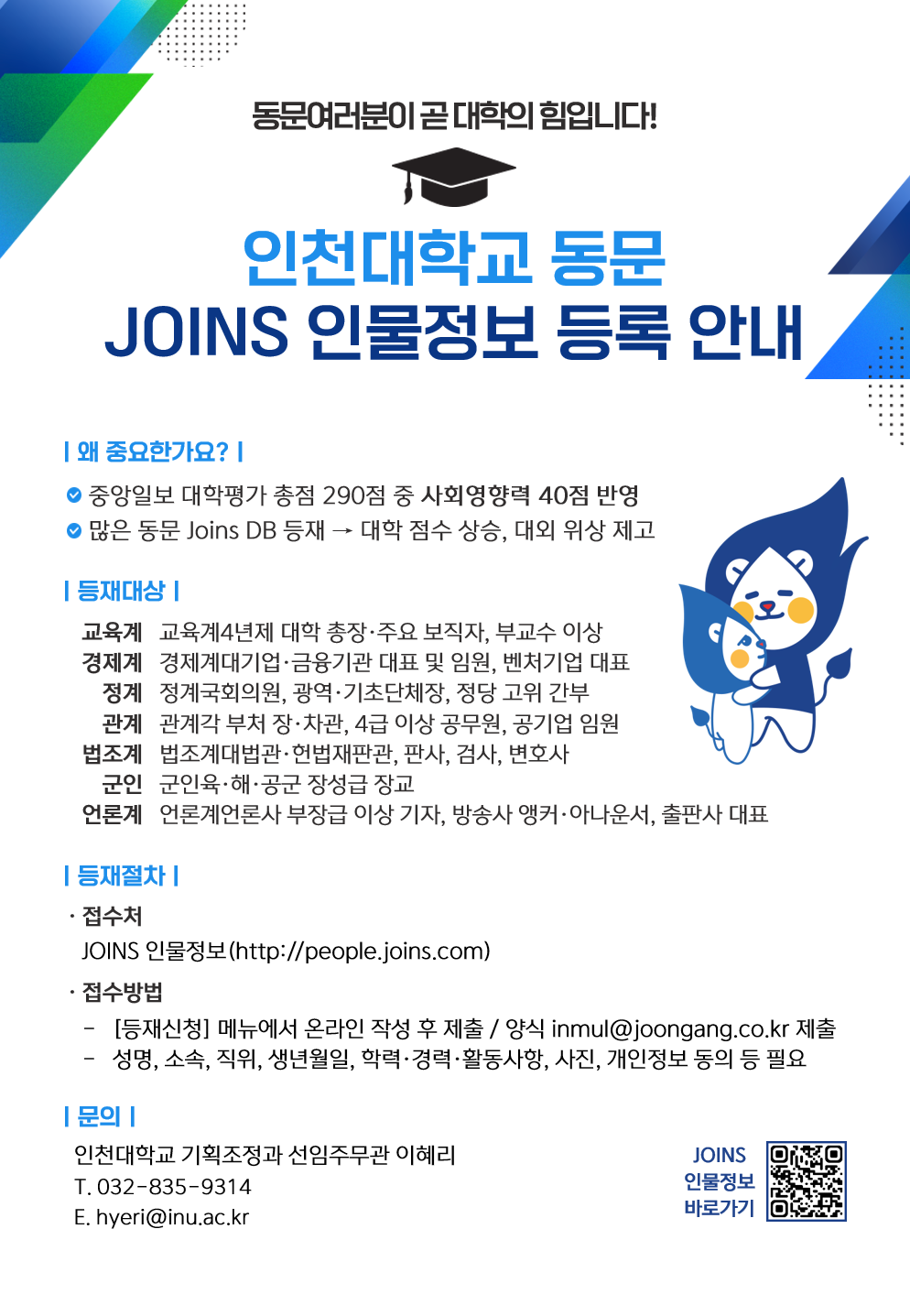 fnctId=bbs,fnctNo=352 인천대학교 동문 JOINS 인물정보 등록 안내 글번호 414922 작성일 2025-11-10 수정일 2025-11-10 작성자 산업경영공학과 (032-835-8926(학부), 8480(대학원)) 조회수 69 첨부파일 첨부파일이(가) 없습니다. 다음글 [IFEZ]"2025 글로벌 항공우주 혁신의 미래" 세미나 개최 김태형 2025-11-10 17:56:05.0 이전글 <기간연장> 3D 모델링 및 3D 프린팅 교육 』 입문/기초과정 학생모집 안내 (~11.17 월(입문), ~11.24 월(기초)) 최준혁 2025-11-10 17:21:43.0 목록