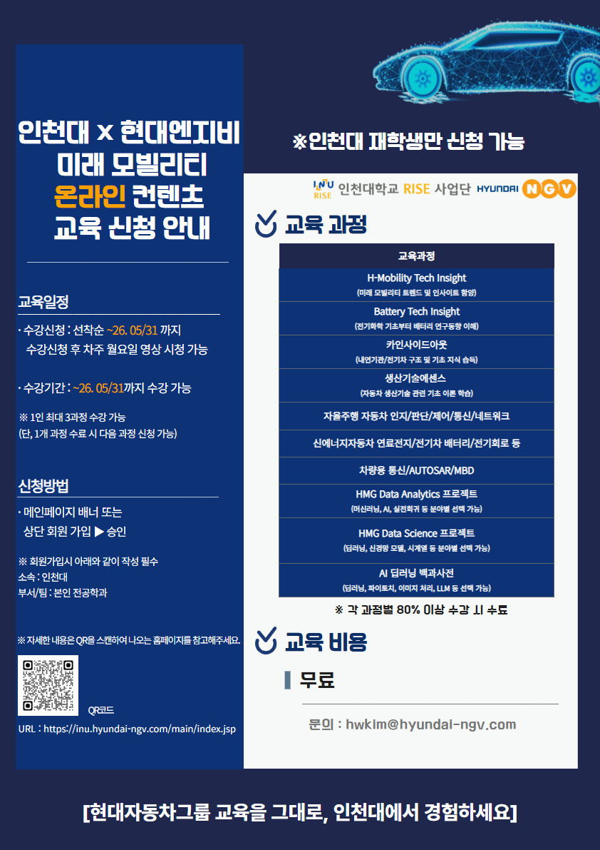 fnctId=bbs,fnctNo=352 인천대 x 현대엔지비 미래 모빌리티 온라인 컨텐츠 교육신청 안내 (~26/05/31까지 선착순 수강신청) 글번호 416589 작성일 2025-12-17 수정일 2025-12-17 작성자 산업경영공학과 (032-835-8926(학부), 8480(대학원)) 조회수 259 첨부파일 첨부파일이(가) 없습니다. 다음글 AI·데이터 기반 포용 아젠다 아이디어 공모전(~26.1.11.일까지) 장유찬 2025-12-23 14:46:32.0 이전글 전기자동차 구동시스템 이해(특강) 안내 [12.30(화)~12.31(수) 09:00~17:00] 김태형 2025-12-17 15:31:52.0 목록
