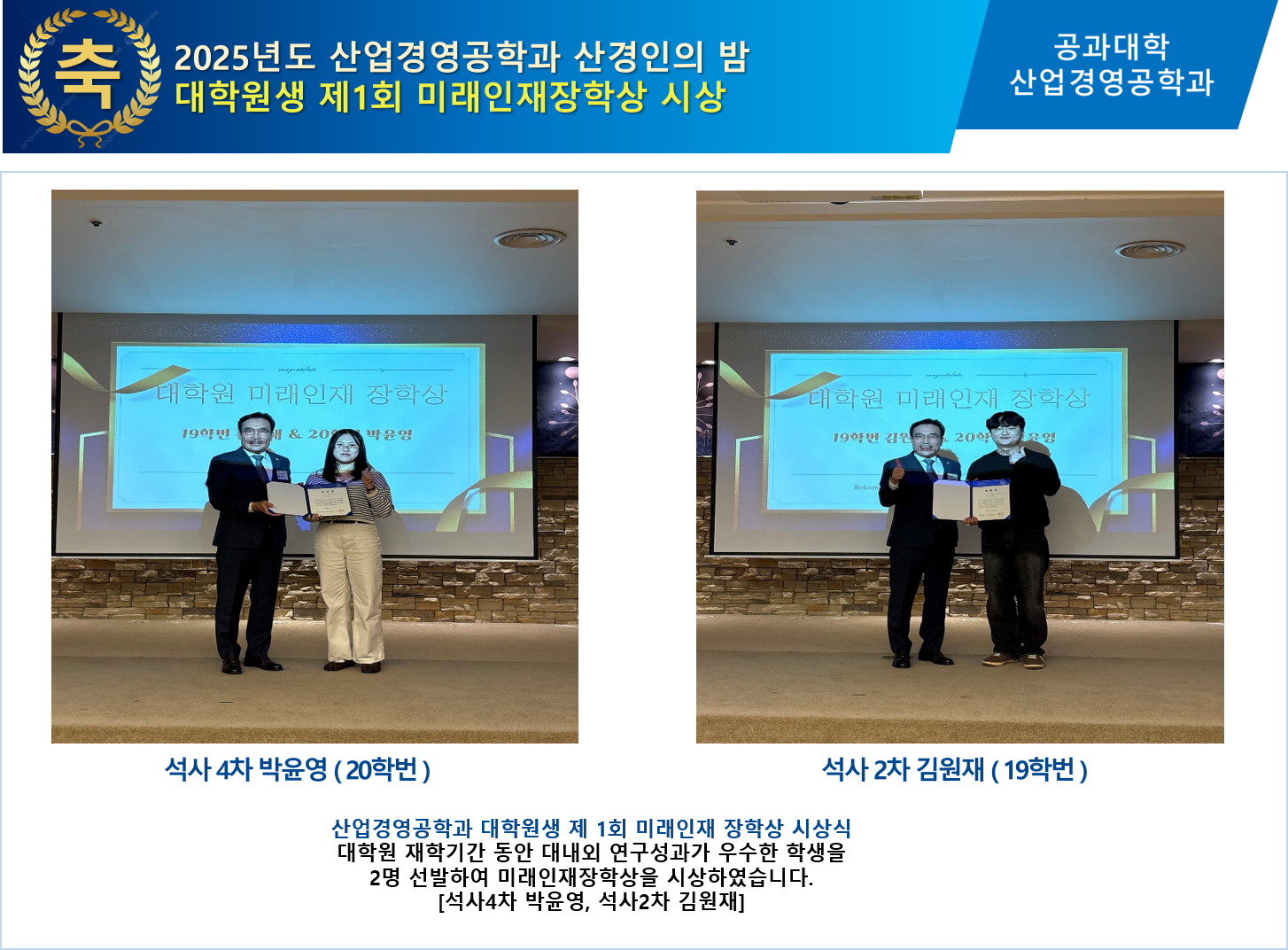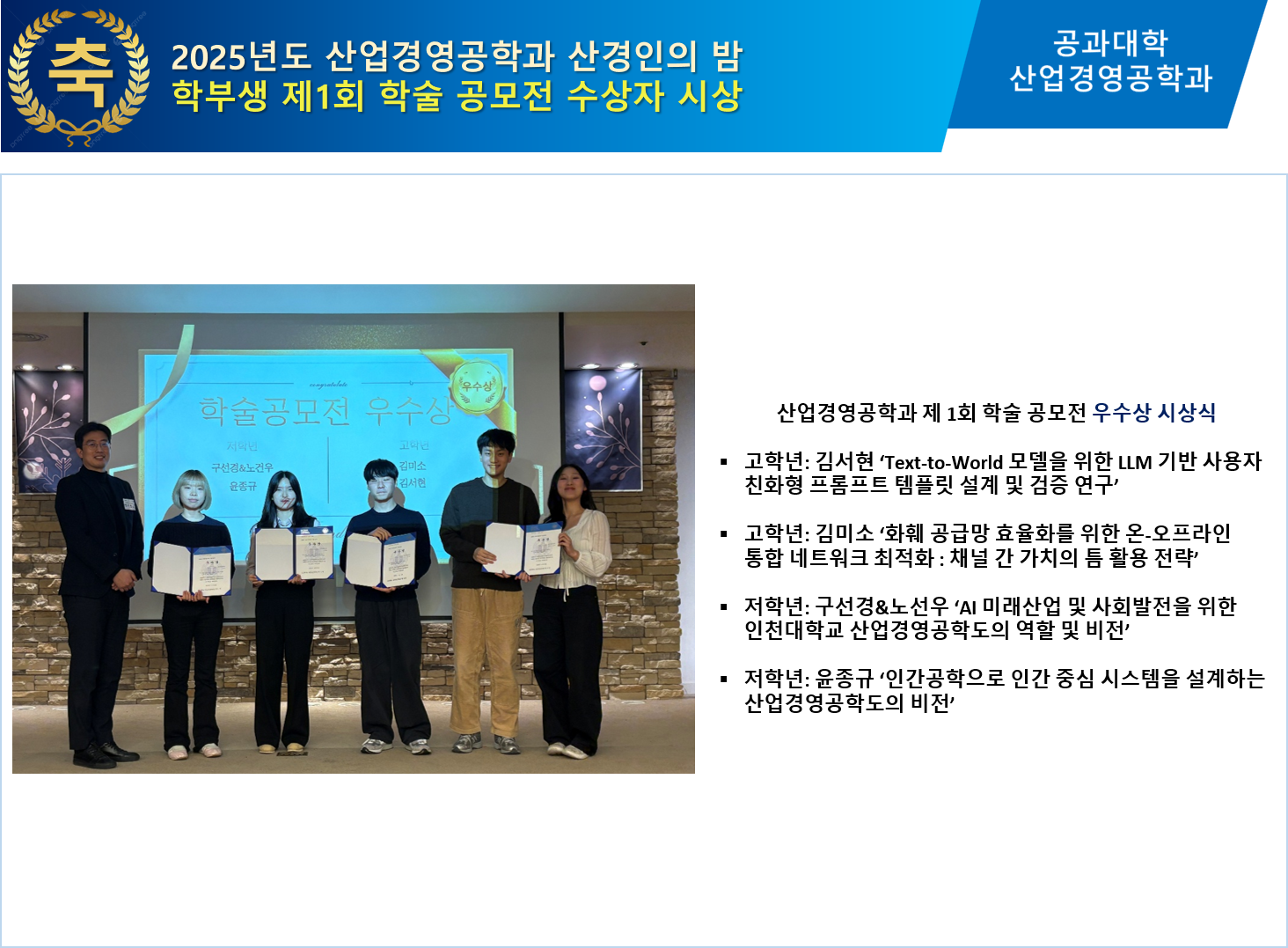 fnctId=bbs,fnctNo=1801 2025년도 산경인의 밤 제1회 학부생 학술공모전 & 대학원생 미래인재장학상 시상 글번호 415975 작성일 2025-12-04 수정일 2025-12-05 작성자 산업경영공학과 (032-835-8926(학부), 8480(대학원)) 조회수 708 첨부파일 첨부파일이(가) 없습니다. 목록