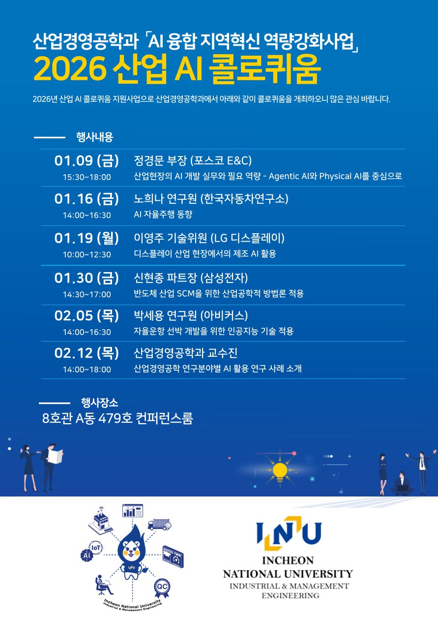fnctId=bbs,fnctNo=1801 [특강] AI 융합 지역혁신 역량강화사업 "2026 산업 AI 콜로퀴움" 글번호 417342 작성일 2026-01-05 수정일 2026-01-20 작성자 산업경영공학과 (032-835-8926(학부), 8480(대학원)) 조회수 627 첨부파일 첨부파일이(가) 없습니다. 목록