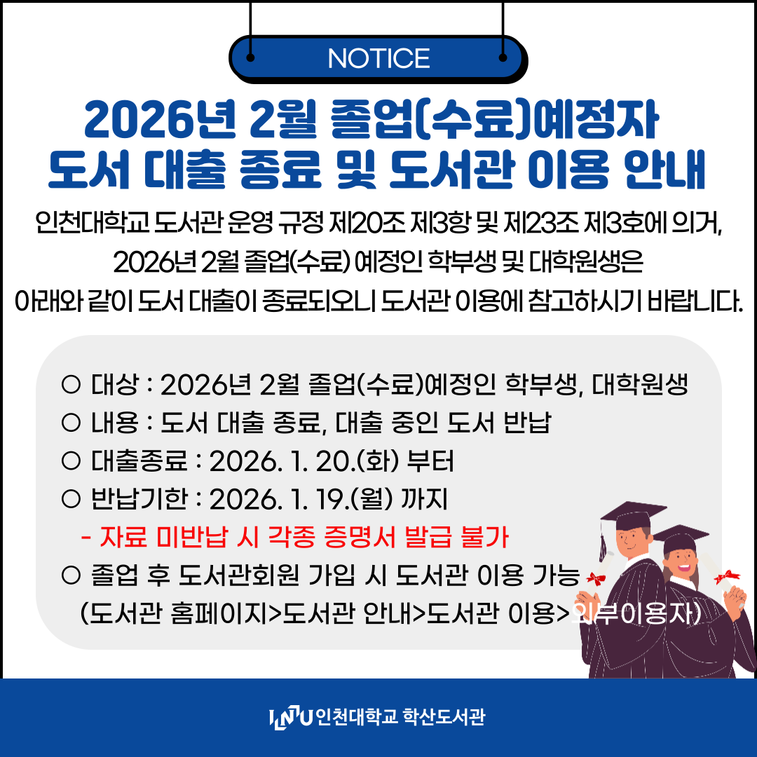 2026년 2월 졸업(수료)예정자 도서 대출 종료 및 도서관 이용 안내