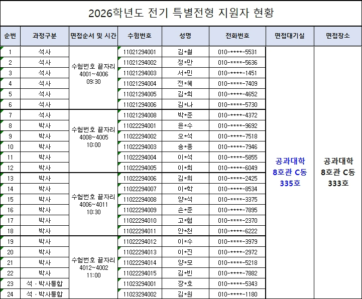 2026학년도 대학원 전기 특별전형 면접장소 및 시간을 아래와 같이 안내 드립니다.